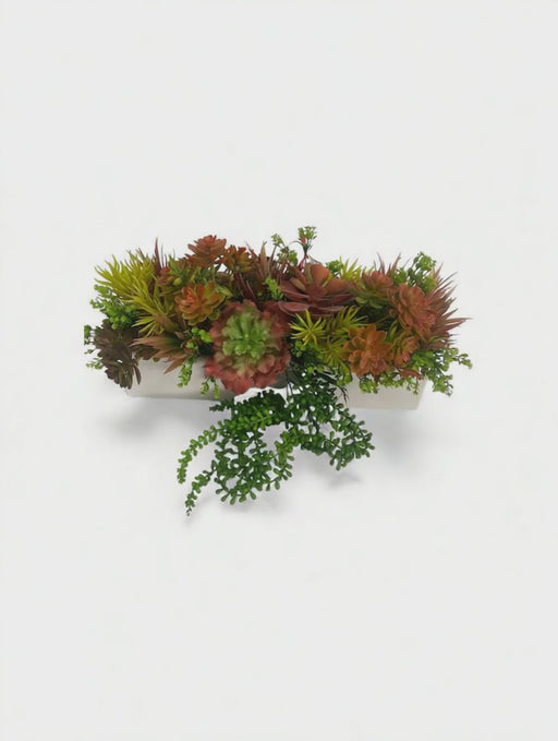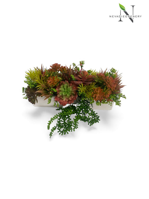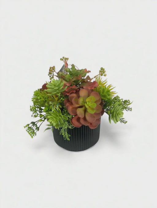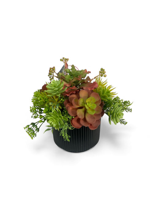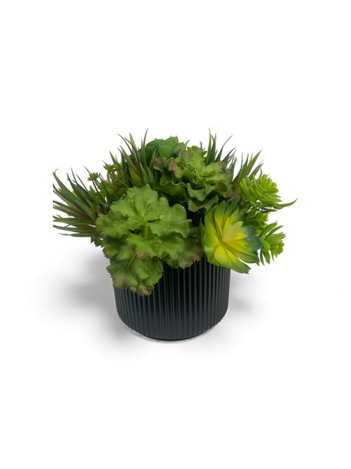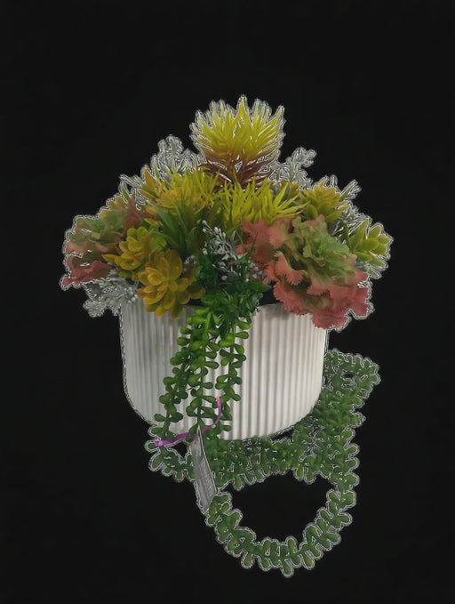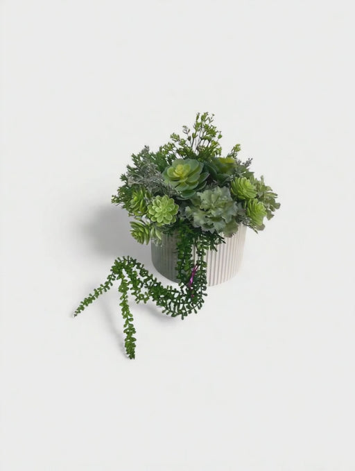 White Ribbed ceramic vase mix green tone succulent
