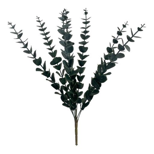 View full detailsA sophisticated artificial eucalyptus spray featuring elongated stems lined with smooth, rounded leaves in a deep, muted green tone. The up...