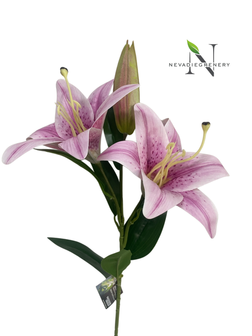 View full detailsThis elegant artificial pink Oriental Lily features two open, star-shaped blooms with soft pink petals, darker speckling, and delicate striping tow...