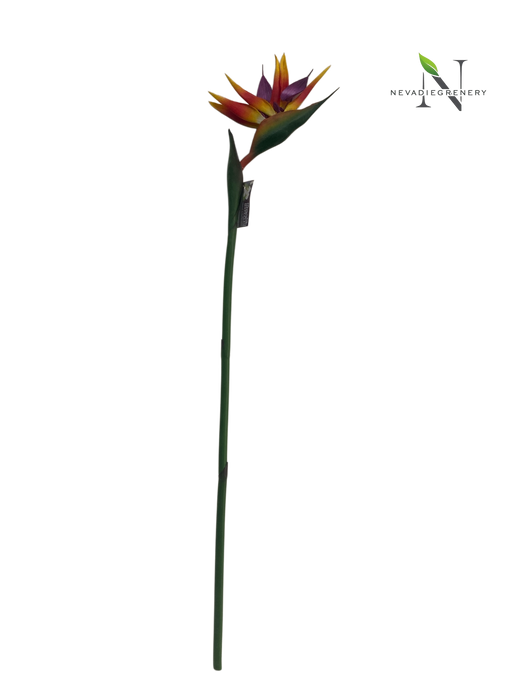 View full detailsA single sculptural stem rises elegantly, topped with a striking bloom featuring layered, pointed petals in rich sunset hues—warm yellows and orang...