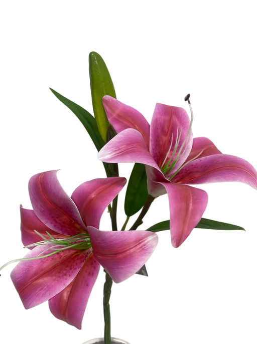 View full detailshis striking artificial Oriental Lily features large, open blooms in rich deep-pink tones, accented with darker centres, soft speckling, and elegan...
