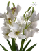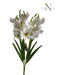 This elegant faux plant features a lush cluster of white Cymbidium-style orchid blooms, beautifully arranged on multiple upright stems for a full, natural look. Each flower showcases soft white petals with subtle green and burgundy accents at the center, carefully crafted to replicate the delicate detail of real orchids. Slender green buds and long, blade-like leaves add height and movement, enhancing its realistic appearance.