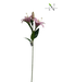 This elegant artificial pink Oriental Lily features two open, star-shaped blooms with soft pink petals, darker speckling, and delicate striping toward the centre. The flowers are accented by pale yellow stamens and accompanied by a realistic unopened bud and glossy green leaves along a natural-looking stem. Perfect for vases, floral arrangements, or statement displays, this faux lily adds colour and sophistication with no maintenance required.